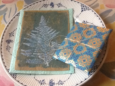 The green one is a print I made many many years ago on a wet day on st martins with an artist called Mandy who created amazing paper sculptures with findings from the windswept beaches. I have always wanted to emulate her one winters beach walk and will do so one day. The card and gift of a tiny green handmade notebook is for Richard who spends his life tending trees and plants.